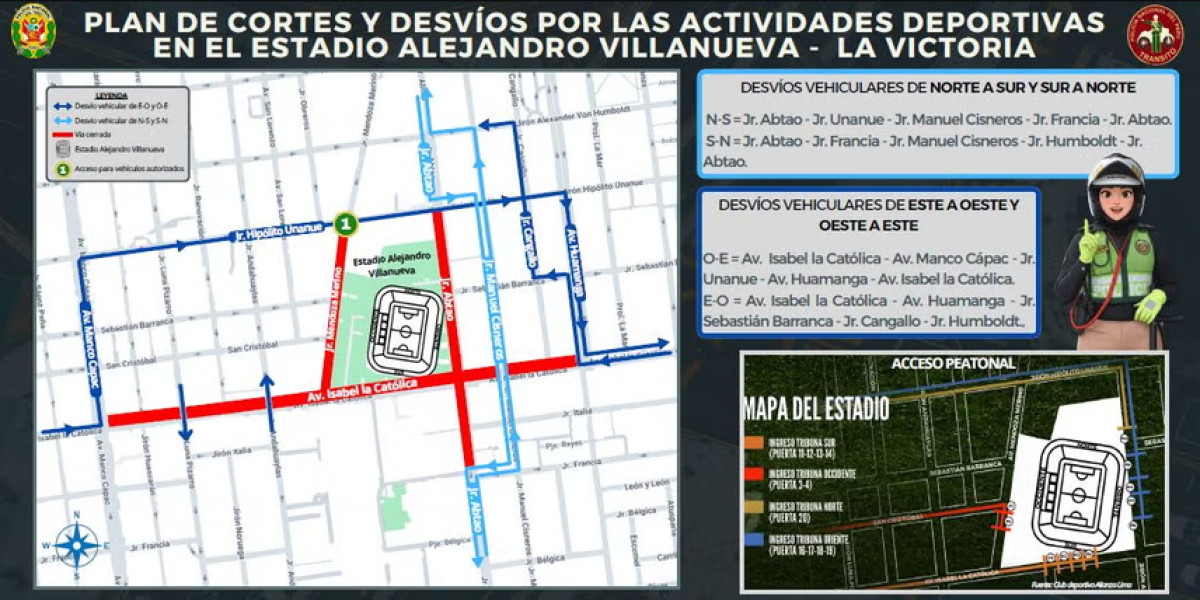 La Policía Nacional del Perú ha implementado un plan especial de desvíos en los alrededores de los estadios Alejandro Villanueva en La Victoria y Monumental en Ate.