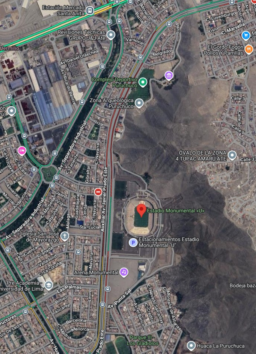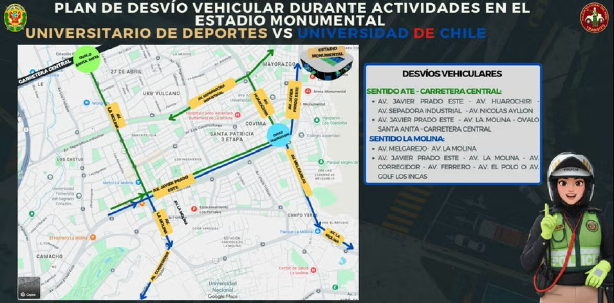 En el caso del estadio Monumental, se ha dispuesto el cierre total de la vía entre la avenida Javier Prado Este, en el tramo comprendido entre la avenida La Molina y Las Palmeras. En el sentido de Ate hacia la Carretera Central, los vehículos deberán circular por la av. Javier Prado Este, av. Huarochirí, av. Separadora Industrial y av. Nicolás Ayllón. En sentido contrario, la ruta alterna será por la av. Javier Prado, av. La Molina, óvalo Santa Anita y la Carretera Central.
