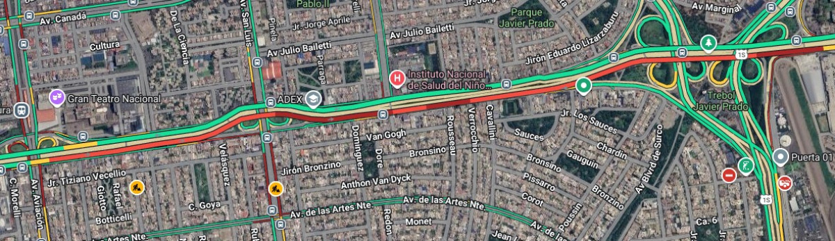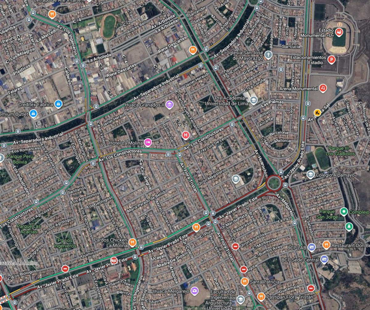 En los alrededores del estadio Monumental se ha reportado congestión vehicular en la avenida Javier Prado. El tráfico avanza demasiado lento desde el cruce con la av. la Molina, pasando por el óvalo Huarochirí, y hasta el cruce con la calle París.