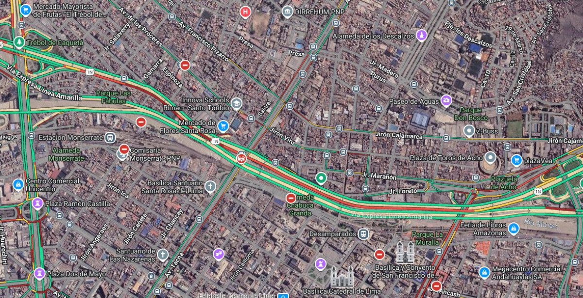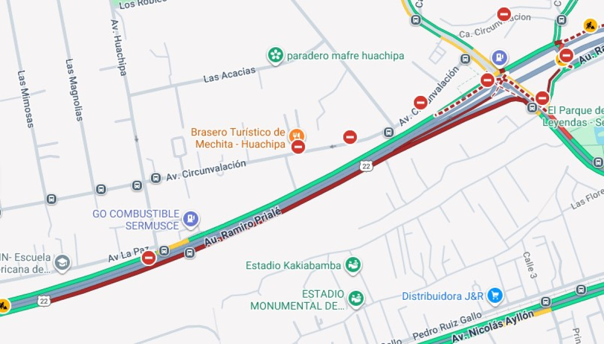 Asimismo, de oeste a este, los vehículos deberán transitar por la av. Isabel La Católica, av. Manco Cápac, jr. Unanue y av. Huamanga. En sentido de este a oeste, la ruta alterna será la av. Isabel La Católica, av. Huamanga, jr. Sebastián Barranca, jr. Cangallo y jr. Humboldt.