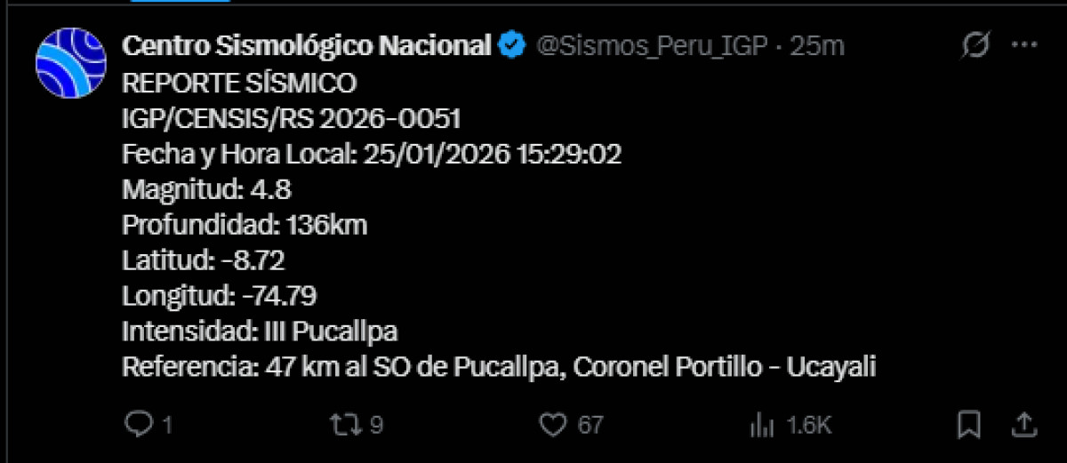 Un temblor de magnitud 4,8 se registró a las 15:29 p. m. a 47 kilómetros al suroeste de Pucallpa, Coronel Portillo. El temblor del 25 de enero del 2026, se registró a una profundidad de 136 kilómetros, según informó el Instituto Geofísico del Perú (IGP) vía Twitter. Recuerda tener siempre lista una mochila de emergencia para estar preparado ante un desastre natural.