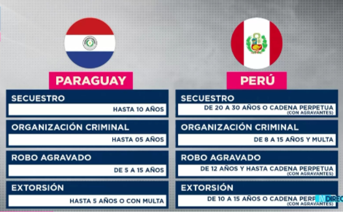 De acuerdo con el abogado penalista, Vladimir Padilla, la justicia peruana no podría imponer una sanción mayor que la contemplada en el país que concede la extradición: Paraguay. "Si lo extraditan, no puedes aplicar esa pena si no existe en su legislación”, indicó en conversación con RPP. Por ello, Moreno será juzgado por los delitos de secuestro y organización criminal, robo agravado y extorsión.