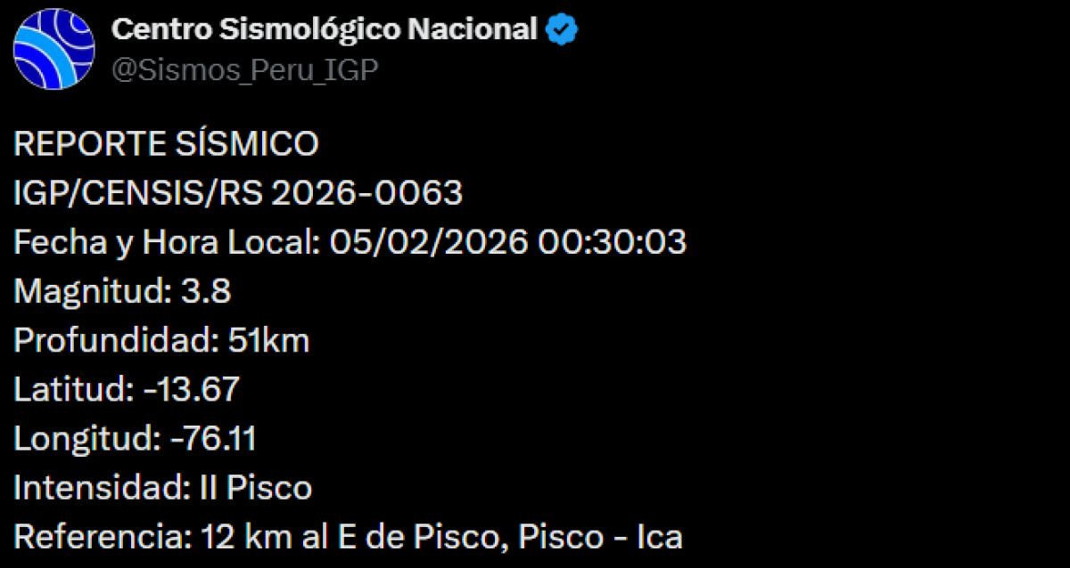 Un sismo de magnitud 3,8 se registró a las 00:30 a. m. a 12 kilómetros al este de Pisco, Pisco - Ica. El temblor del 5 de febrero de 2026, se registró a una profundidad de 51 kilómetros, según informó el Instituto Geofísico del Perú (IGP) vía X. Recuerda tener siempre lista una mochila de emergencia para estar preparado ante un desastre natural.