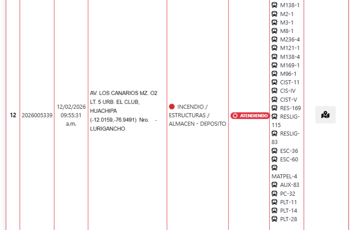 Un grave incendio código 3 fue reportado a las 09:55 a. m. en la avenida Los Canarios, en la urbanización El Club, en la zona de Huachipa. Según el informe del Cuerpo General de Bomberos Voluntarios del Perú, la emergencia ha movilizado al menos 20 unidades, entre cisternas y ambulancias.