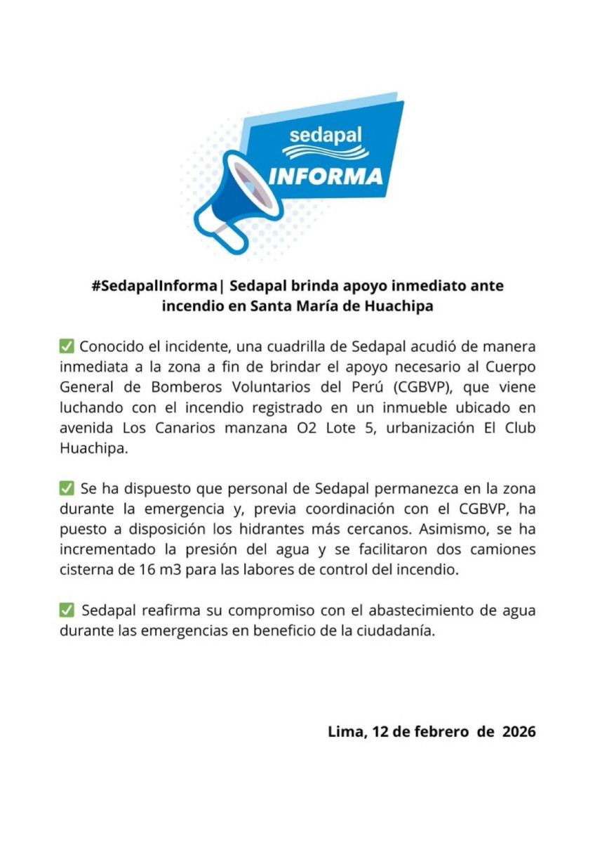 Debido al incidente, una cuadrilla de Sedapal acudió de manera inmediata a la zona a fin d ebrindar apoyo necesario al Cuerpo General de Bomberos Voluntarios del Perú.