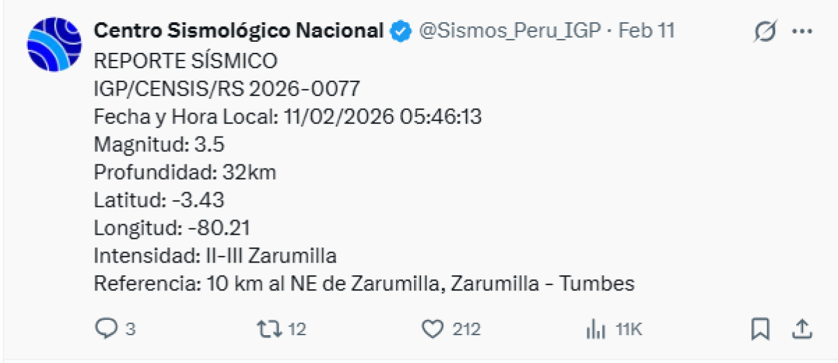 Un sismo de 3,5 se registró el día de ayer, 11 de febrero, a las 05:46 a.m. en el departamento de Tumbes. El movimiento telúrico tuvo como epicentro la ciudad de Zarumilla, a unos 10 kilómetros al norteste de la metrópoli.
