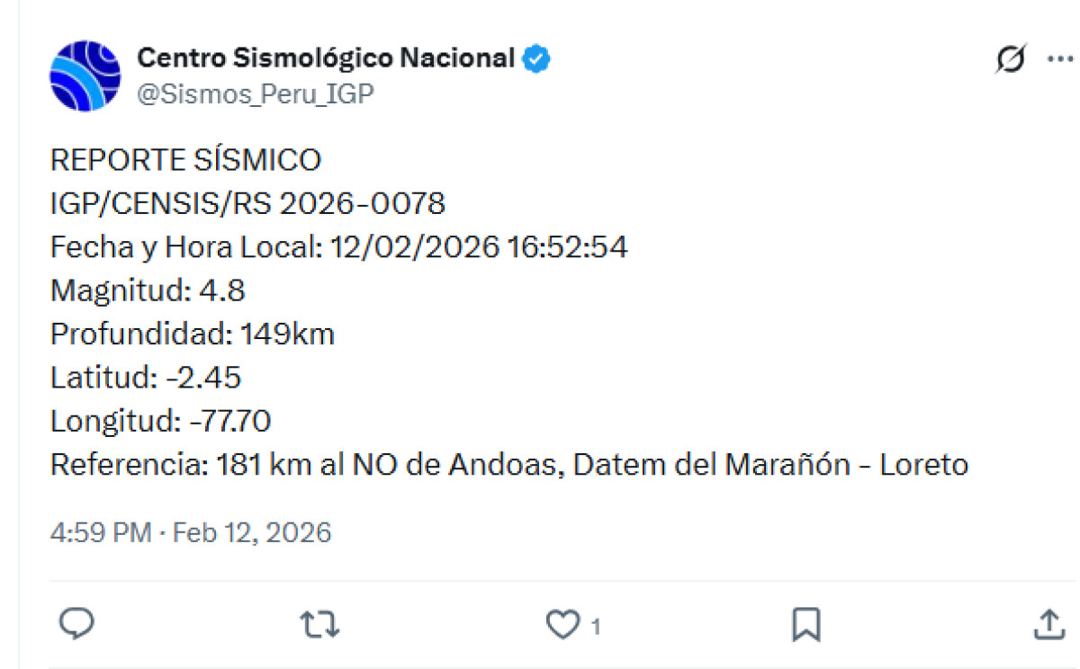 Un sismo de 4,8 se registró el día de hoy, 12 de febrero, a las 16:52 p.m. en el departamento de Loreto. El movimiento telúrico tuvo como epicentro la ciudad de Andoas, Datem del Marañon a unos 181 kilómetros al norteste de la metrópoli.