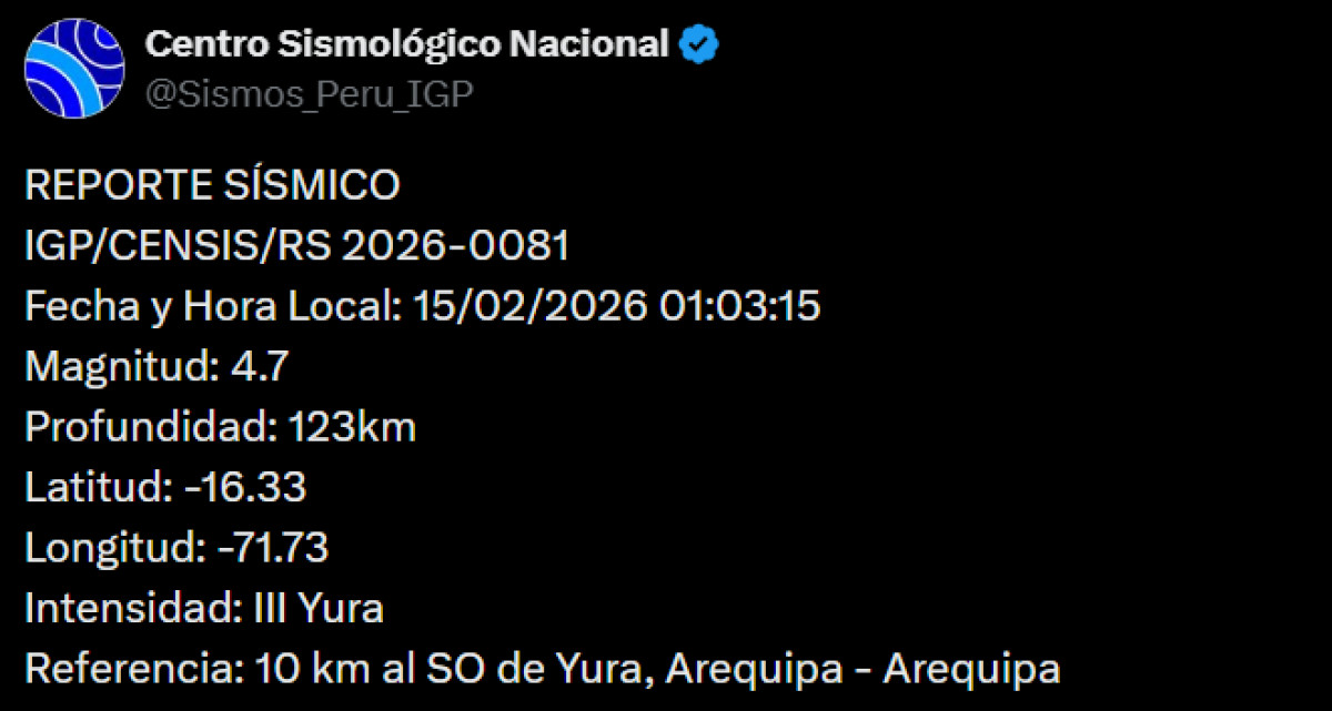 Un sismo de magnitud 4,7 se registró a las 01:03 a. m. a 10 kilómetros al suroeste de Yura, Arequipa - Arequipa. El temblor del domingo 15 de febrero de 2026, se registró a una profundidad de 123 kilómetros, según informó el Instituto Geofísico del Perú (IGP) vía X. Recuerda tener siempre lista una mochila de emergencia para estar preparado ante un desastre natural.