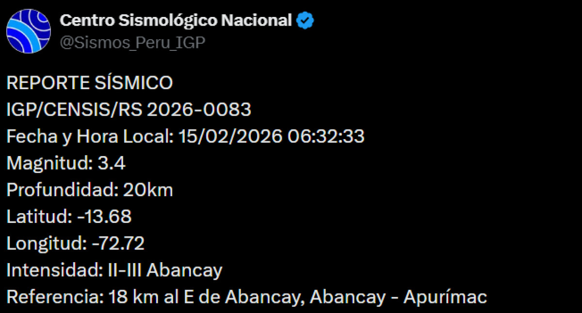 Un sismo de magnitud 3,4 se registró a las 06:32 a. m. a 18 kilómetros al este de Abancay, Abancay - Apurímac. El temblor del domingo 15 de febrero de 2026, se registró a una profundidad de 20 kilómetros, según informó el Instituto Geofísico del Perú (IGP) vía X. Recuerda tener siempre lista una mochila de emergencia para estar preparado ante un desastre natural.