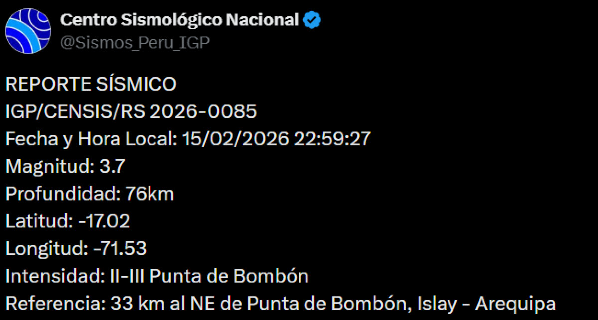 Un sismo de magnitud 3,7 se registró a las 22:59 p. m. a 33 kilómetros al noreste de Bombón, Islay - Arequipa. El temblor del 15 de febrero de 2026, se registró a una profundidad de 76 kilómetros, según informó el Instituto Geofísico del Perú (IGP) vía X. Recuerda tener siempre lista una mochila de emergencia para estar preparado ante un desastre natural.