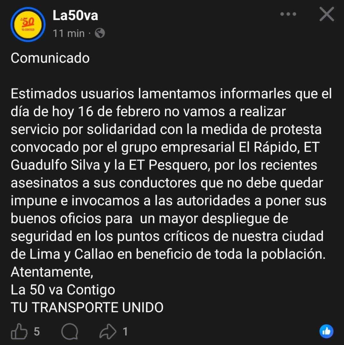 La empresa de transporte conocida como La 50 informó que este 16 de febrero no brindará servicio como muestra de respaldo a la paralización impulsada por el grupo empresarial El Rápido, así como por otras compañías del sector. A través de un comunicado difundido en redes sociales, la operadora indicó que la medida responde a los recientes asesinatos de conductores, hechos que han generado preocupación entre los trabajadores del rubro.