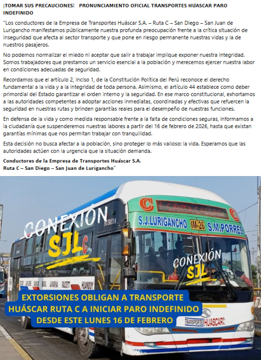 La Empresa de Transportes Huáscar S.A., que opera la ruta C entre San Diego y San Juan de Lurigancho, anunció el inicio de un paro indefinido desde el lunes 16 de febrero de 2026. A través de un pronunciamiento, los conductores señalaron que la decisión responde a la situación de inseguridad que viene afectando al sector transporte y que, según indicaron, expone de manera permanente la integridad de trabajadores y pasajeros.