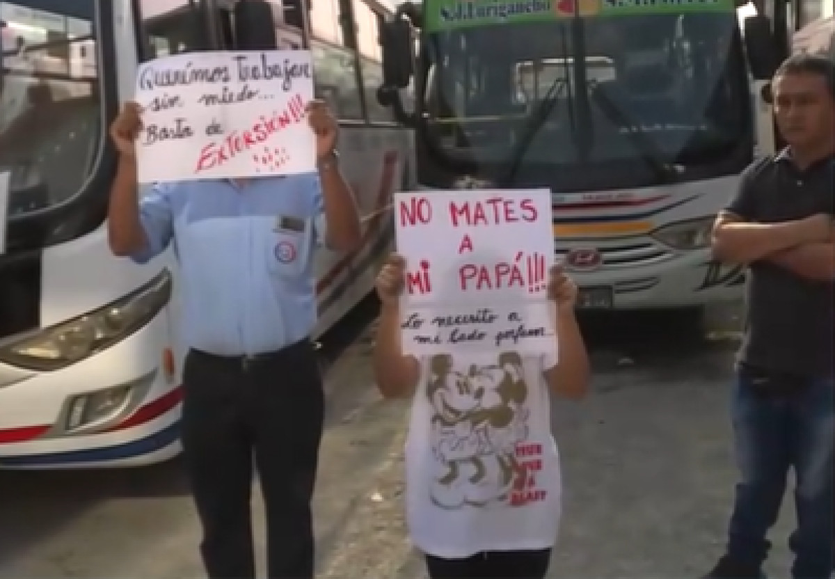 Los transportistas de la empresa Transportes Huáscar S.A., Línea C, paralizaron sus servicios debido a la ola extorsiva. En su patio de maniobras detuvieron las unidades de manera indefinida, mientras cobradores, choferes e incluso familiares de los trabajadores sostenían carteles con mensajes como: “No mates a mi papá, lo necesito a mi lado”.
