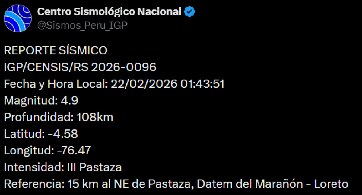 Un sismo de magnitud 4,9 se registró a las 01:43 a. m. a 15 kilómetros al noreste de Pastaza, Datem del Marañón - Loreto. El temblor del 22 de febrero de 2026, se registró a una profundidad de 108 kilómetros, según informó el Instituto Geofísico del Perú (IGP) vía X. Recuerda tener siempre lista una mochila de emergencia para estar preparado ante un desastre natural.