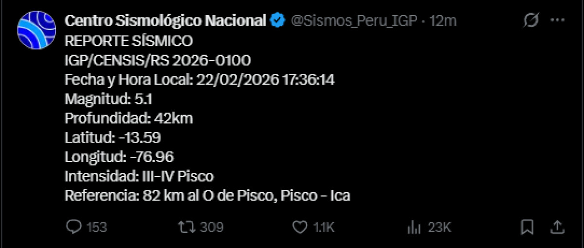 Un sismo de magnitud 5,1 se registró a las 17:36 p. m. a 82 kilómetros al oeste de Pisco, Ica. El temblor del 22 de febrero de 2026, se registró a una profundidad de 42 kilómetros, según informó el Instituto Geofísico del Perú (IGP) vía X.