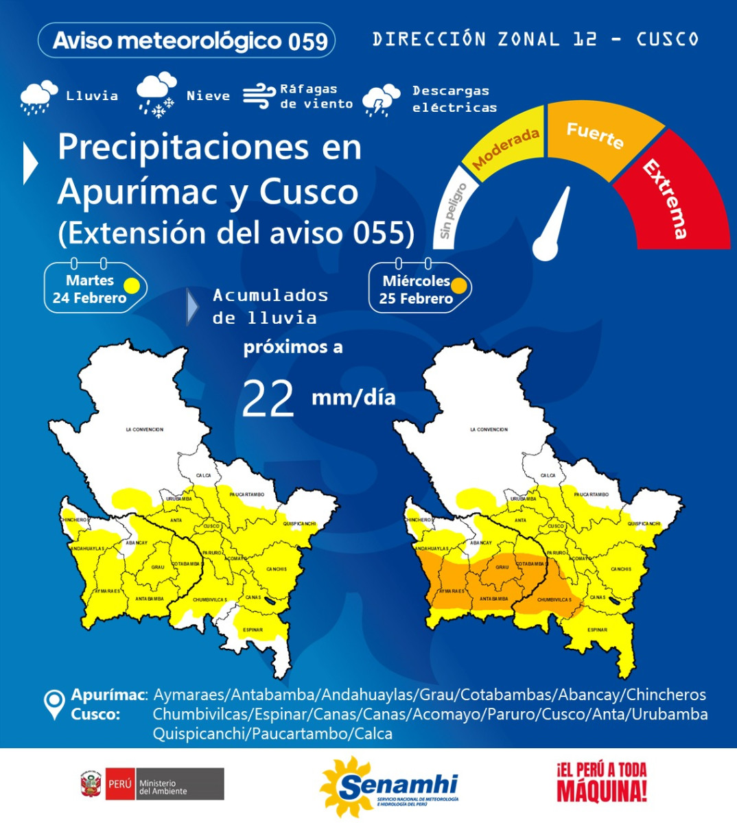 La auroridad informó que, del 24 al 25 de febrero, se espera la presencia de precipitaciones en Apurímac y la sierra de Cusco.
