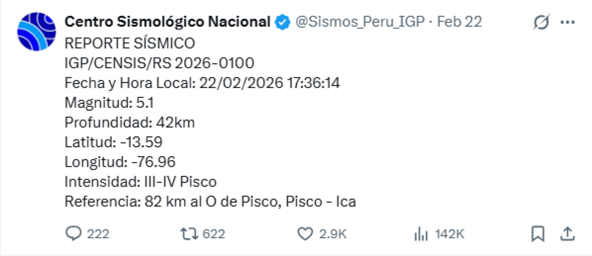 Un sismo de magnitud 5,1 se registró en la región de Ica a las 17:26 del domingo 22 de febrero. El movimiento telúrico tuvo como epicentro la ciudad de Pisco a unos 82 kilómetros de la metrópoli, según informó el Centro Sismológico Nacional.