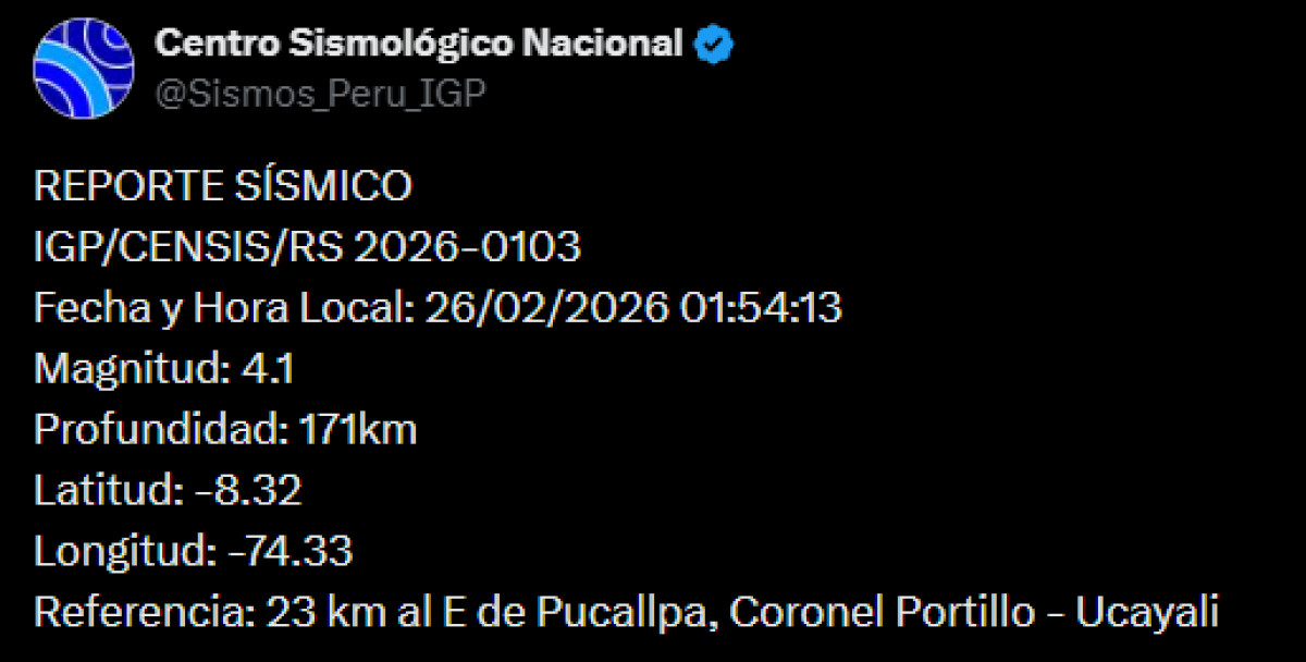 A las 01:54 a.m. de este jueves 26 de febrero, Ucayali registró un sismo de magnitud 4,1. El epicentro se dio a 23 km al este de Pucallpa, Portillo, según el Centro Sismológico Nacional.
