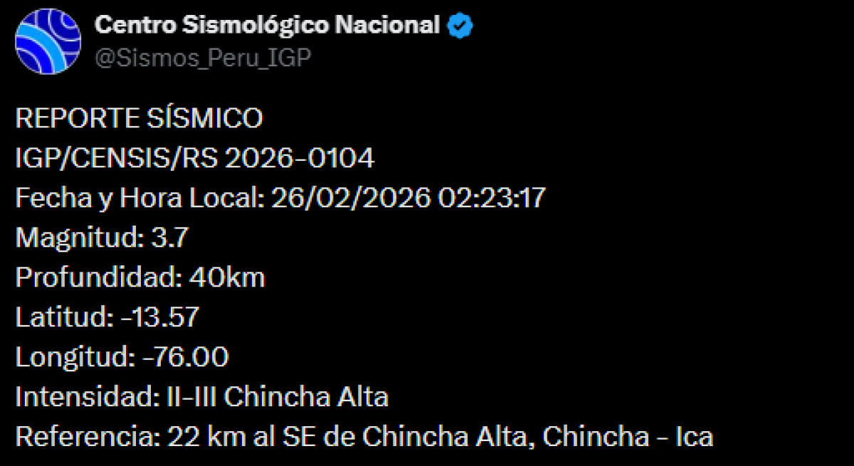 Un temblor de magnitud 3,7 se registró a las 02:23 a. m. a 22 kilómetros al suroeste de Chincha Alta, Ica. El temblor del 26 de febrero de 2026, se registró a una profundidad de 40 kilómetros, según informó el Instituto Geofísico del Perú (IGP) vía Twitter. Recuerda tener siempre lista una mochila de emergencia para estar preparado ante un desastre natural.