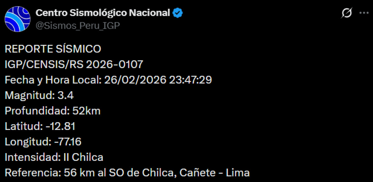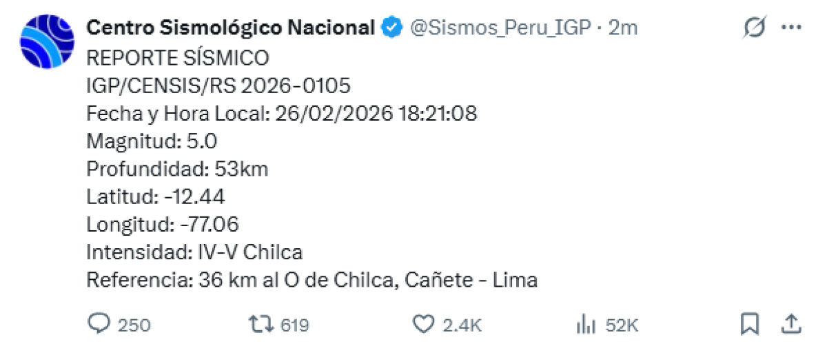 Un temblor de magnitud 5,0 se registró a las 18:21 p. m. a 36 kilómetros al oeste de Chilca, Cañete, Lima. El temblor del 26 de febrero de 2026, se registró a una profundidad de 53 kilómetros, según informó el Instituto Geofísico del Perú (IGP) vía Twitter.