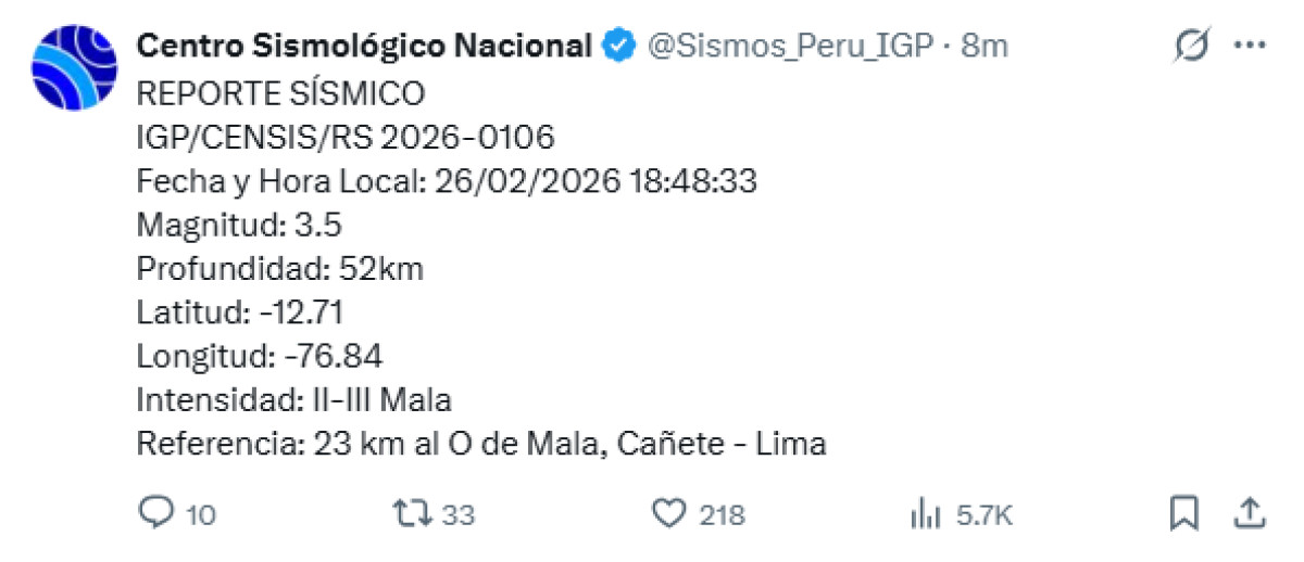 Un temblor de magnitud 3,5 se registró a las 18:48 p. m. a 23 kilómetros al oeste de Mala, Cañete, Lima. El temblor del 26 de febrero de 2026, se registró a una profundidad de 52 kilómetros, según informó el Instituto Geofísico del Perú (IGP) vía Twitter.