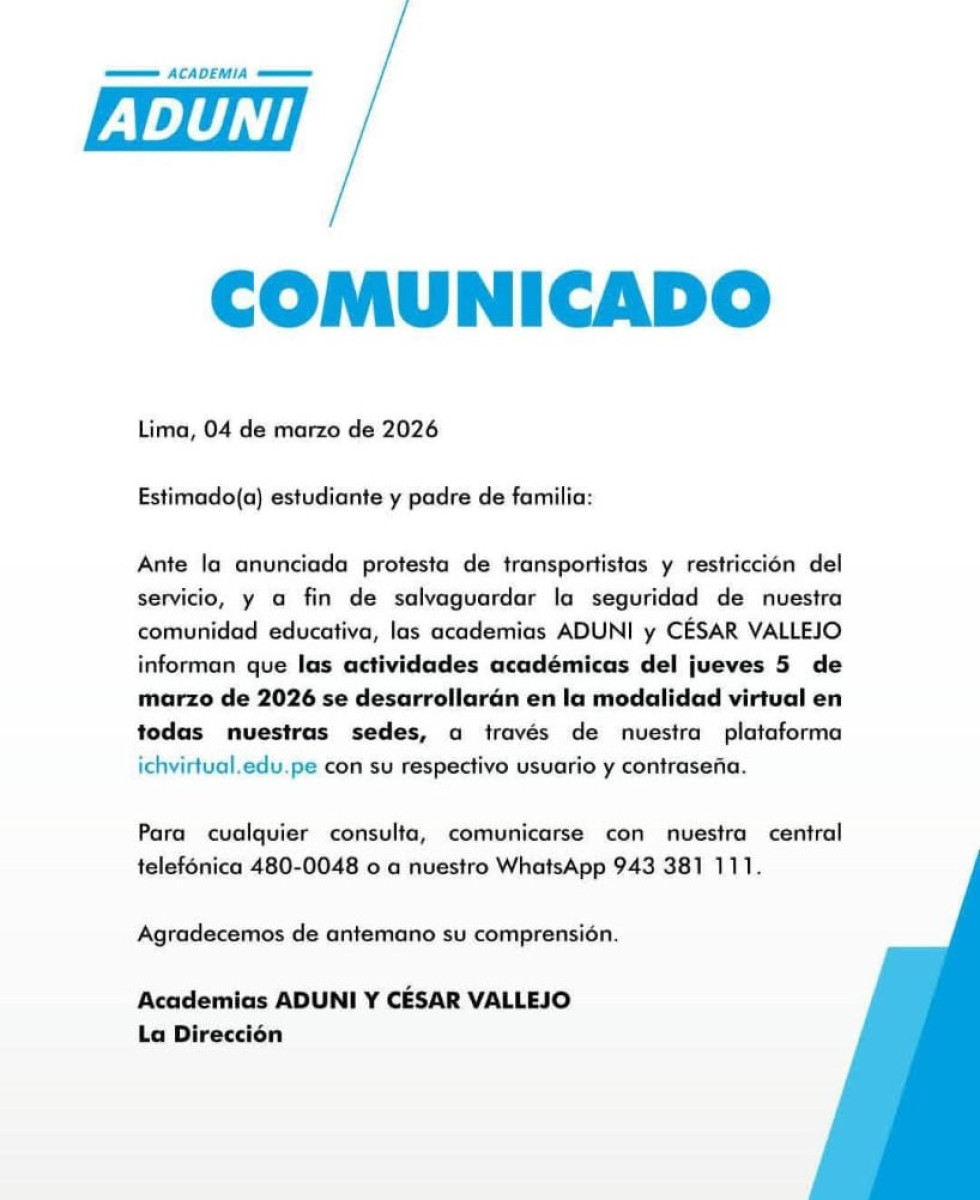 Suspenden actividades presenciales en Academia ADUNI y César Vallejo