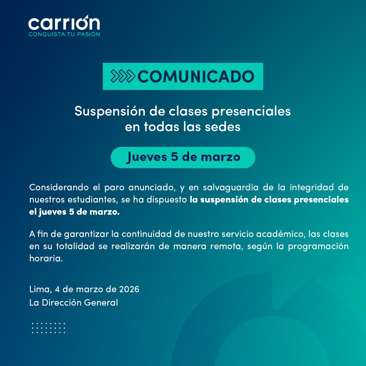 La institución informó que, debido a la coyuntura del transporte, las clases y otras actividades se desarrollarán de manera virtual.