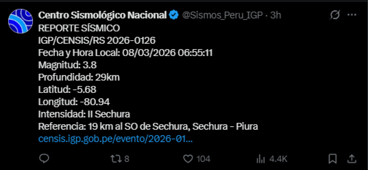 Un temblor de magnitud 3,8 se registró a las 06:55 a. m. a 19 kilómetros al suroeste de Sechura, Piura. El temblor del 8 de marzo, se registró a una profundidad de 29 kilómetros, según informó el Instituto Geofísico del Perú (IGP) vía Twitter. Recuerda tener siempre lista una mochila de emergencia para estar preparado ante un desastre natural.