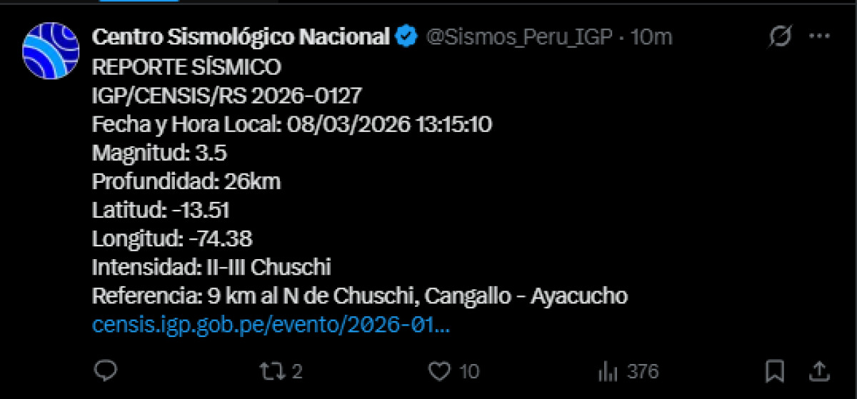 Un temblor de magnitud 3,5 se registró a las 13:15 p. m. a 9 kilómetros al norte de Chuschi, Ayacucho. El temblor del 8 de marzo, se registró a una profundidad de 26 kilómetros, según informó el Instituto Geofísico del Perú (IGP) vía Twitter. Recuerda tener siempre lista una mochila de emergencia para estar preparado ante un desastre natural.