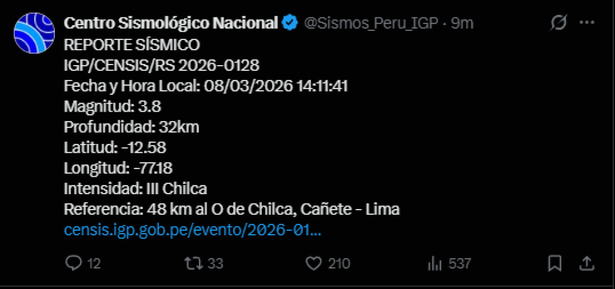 Un sismo de magnitud 3,8 se registró a las 14:11 p. m. a 48 kilómetros al oeste de Chilca, Cañete. El temblor del 8 de marzo, se registró a una profundidad de 32 kilómetros, según informó el Instituto Geofísico del Perú (IGP) vía Twitter. Recuerda tener siempre lista una mochila de emergencia para estar preparado ante un desastre natural.