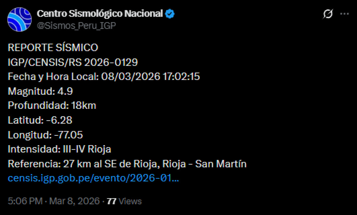 Temblor HOY en San Martín, 8 de marzo, según IGP: ¿de qué magnitud fue el último sismo?