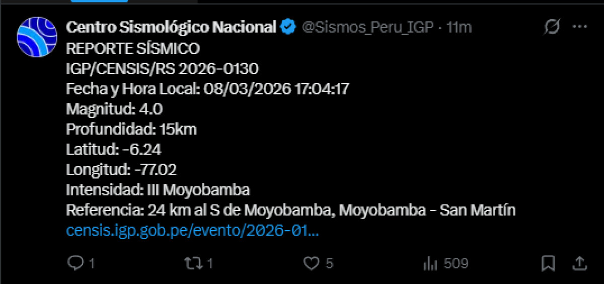 Un nuevo sismo de magnitud 4,0 se registró a las 17:04 p. m. a 27 kilómetros al sur de Moyobamba, San Martín, tan solo 2 minutos después. El temblor del 8 de marzo, se registró a una profundidad de 15 kilómetros, según informó el Instituto Geofísico del Perú (IGP) vía Twitter. Recuerda tener siempre lista una mochila de emergencia para estar preparado ante un desastre natural.