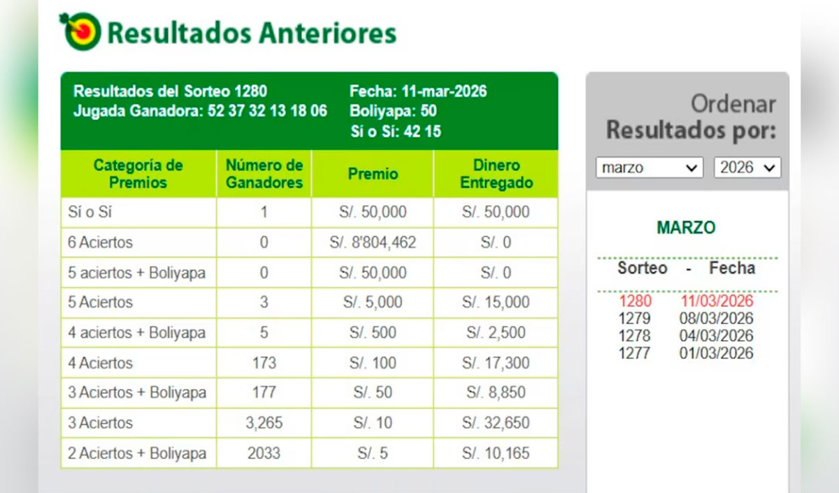 Los resultados de La Tinka fueron: 52, 37, 32, 13, 18, 6, y boliyapa 50