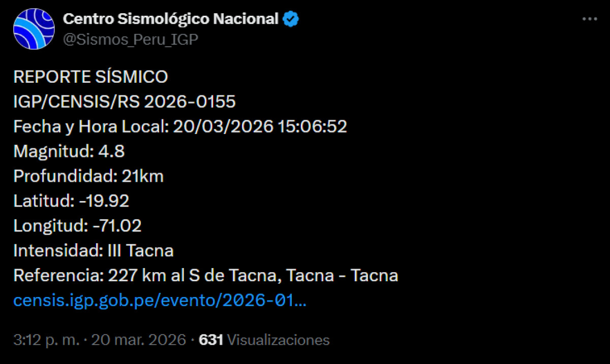 Un temblor de magnitud 3,8 se registró a las 18:04 p. m. a 93 kilómetros al suroeste de Tacna. El temblor del 20 de marzo, se registró a una profundidad de 23 kilómetros, según informó el Instituto Geofísico del Perú (IGP) vía Twitter. Recuerda tener siempre lista una mochila de emergencia para estar preparado ante un desastre natural.