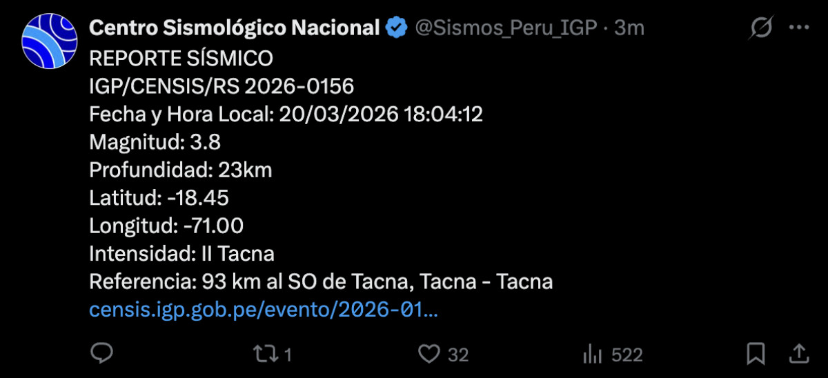 Conoce los reportes detallados y actualizados sobre la actividad sísmica en el país y toda la información sobre el último temblor de hoy 20 de marzo de 2026 en Perú. En nuestro país, los reportes de sismos son brindados principalmente por el Instituto Geofísico del Perú (IGP). Este instituto se encarga de monitorear la actividad sísmica en el país y proporciona información actualizada sobre sismos, incluyendo su magnitud, ubicación y profundidad.