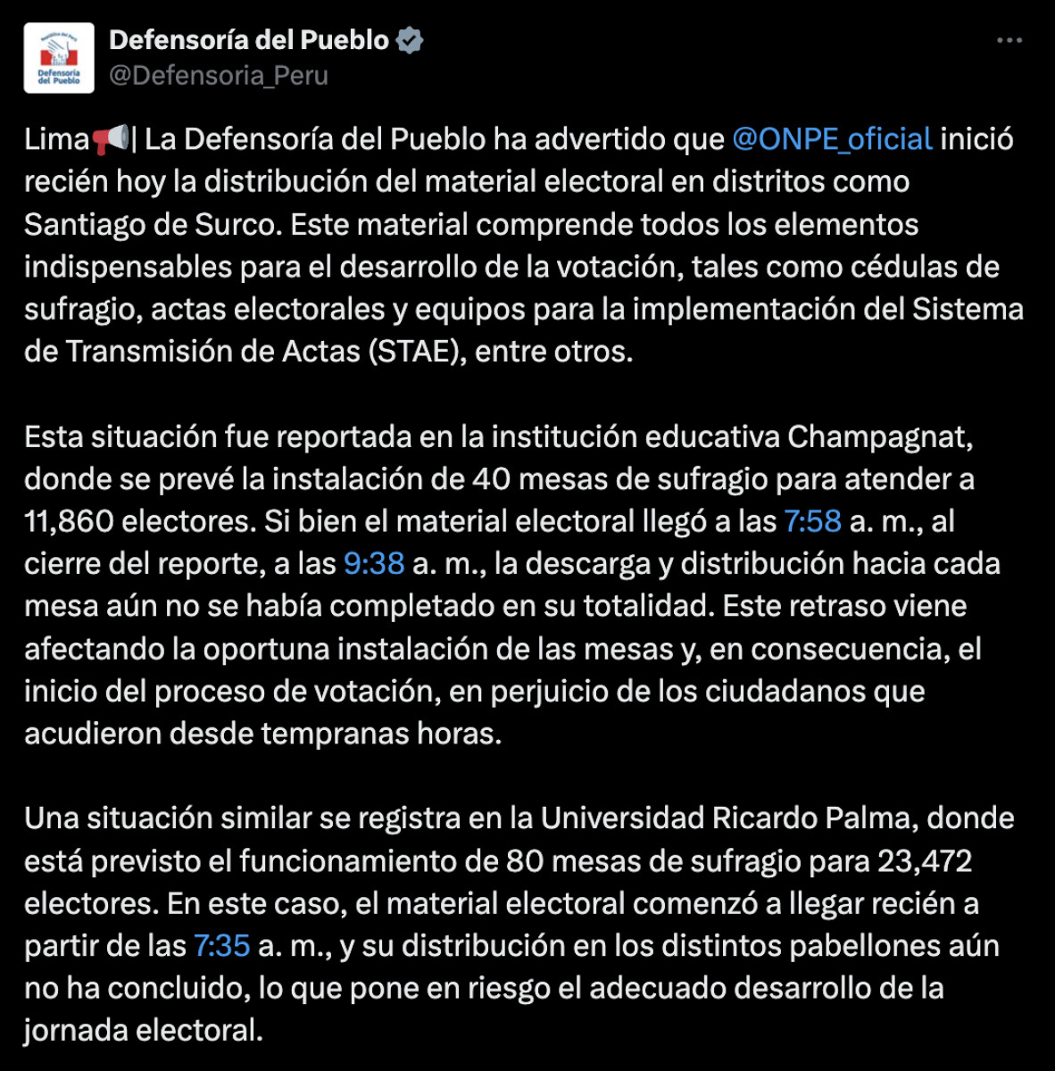 La Defensoría del Pueblo advirtió que la ONPE inició recién el mismo día la distribución de material electoral en distritos como Santiago de Surco, incluyendo cédulas, actas y equipos del sistema STAE. En el colegio Champagnat, con 40 mesas para 11,860 electores, el material llegó a las 7:58 a. m., pero a las 9:38 a. m. aún no se completaba su distribución, retrasando la instalación. En la Universidad Ricardo Palma, con 80 mesas para 23,472 votantes, el material empezó a llegar a las 7:35 a. m. y seguía repartiéndose. La entidad pidió calma mientras se regulariza el proceso.