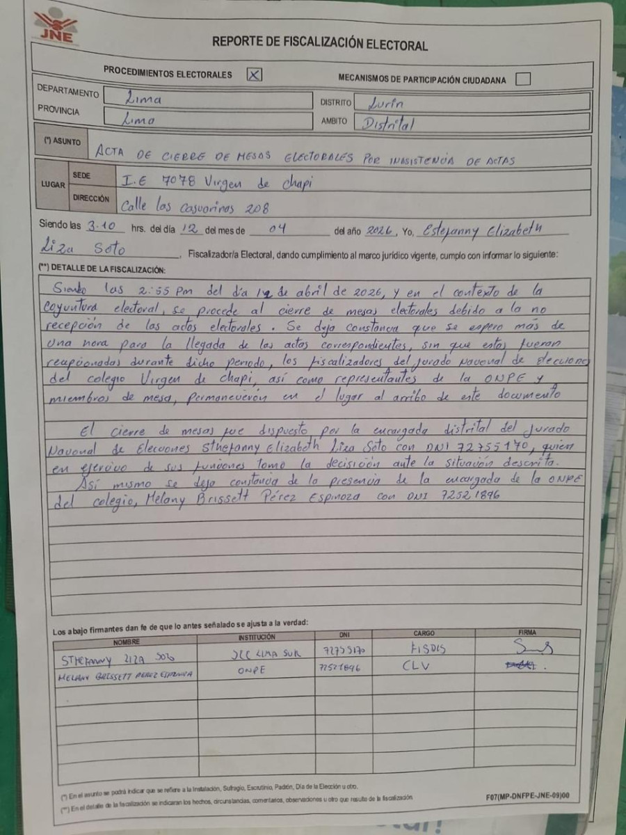 ONPE decidió el cierre de la Institución Educativa 7078 Virgen de Chapi en Lurín. En el acta se observa que el motivo de la cancelación se debe a la ausencia de material electoral.