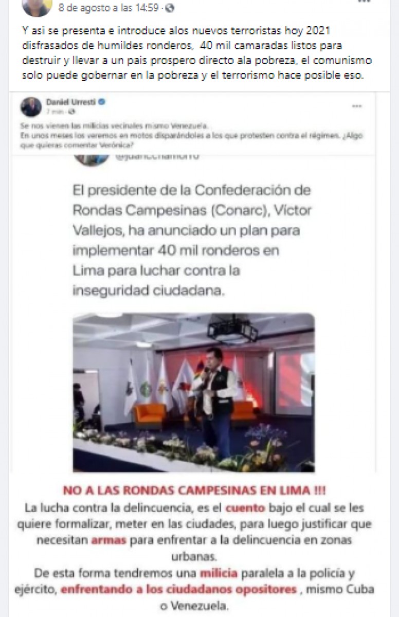 En la publicación viral, se puede observar el nombre del excandidato presidencial Daniel Urresti, pero en su perfil de Facebook no aparece ninguna publicación relacionada al tema. En cambio, en Twitter se puede encontrar un mensaje sobre las rondas campesinas realizado el 3 de agosto.
