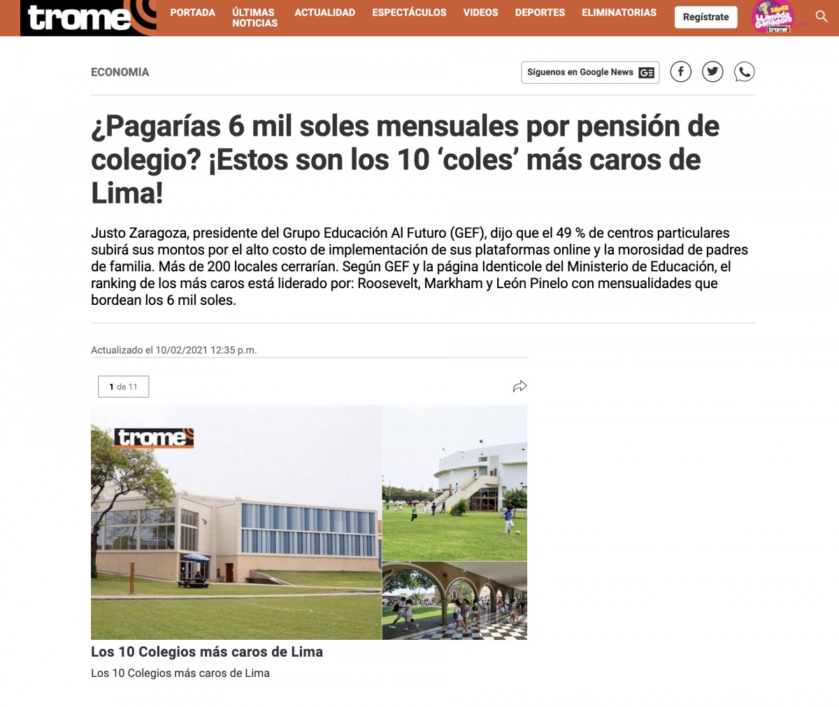 En efecto, la imagen de la cadena fue extraída de una nota periodística del diario Trome publicada el 10 de febrero de 2021 bajo el siguiente título: “¿Pagarías 6.000 soles mensuales por pensión de colegio? ¡Estos son los 10 ‘coles’ más caros de Lima!”. La foto de portada es una composición en la que aparecen el Colegio Roosevelt, el Colegio Áleph y el Markham College.