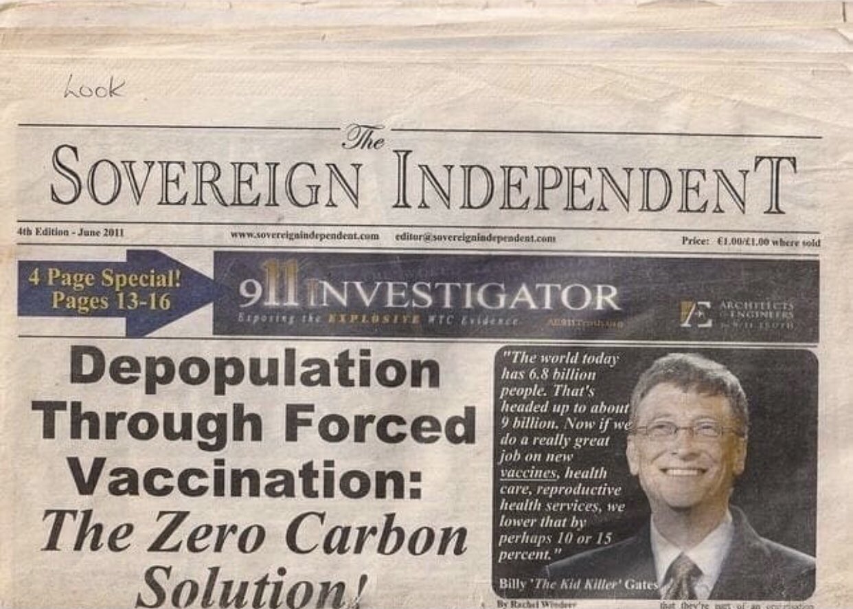 La publicación presenta la portada de un diario llamado “The Sovereign Independent”, fechada en junio de 2011. La carátula muestra el siguiente titular en inglés: “Depopulation Through Forced Vaccination: The Zero Carbon Solution!”.