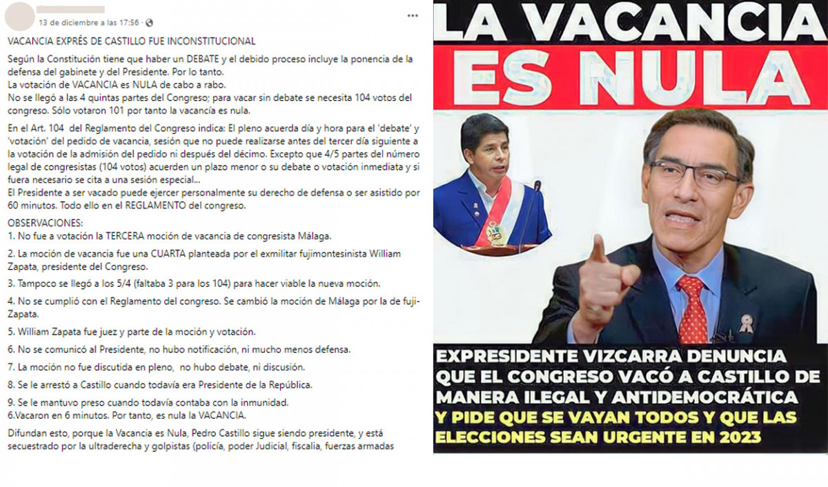 La publicación más antigua de esta descripción sobre los supuestos motivos de la nulidad de la vacancia de Castillo proviene del 13 de diciembre de 2022. El post sugiere que el exmandatario Martín Vizcarra dijo que la vacancia es nula y que toda la descripción indicada es de su autoría. Pero en su transmisión en vivo del 12 de diciembre, Vizcarra no expresó esas palabras. Sí, cuestionó el proceso de vacancia de Castillo porque, según él, no siguió el debido proceso. Incluso en una parte precisó que “nadie está pidiendo que Castillo regrese porque su delito lo inhabilita, lo imposibilita de qué él continúe”.