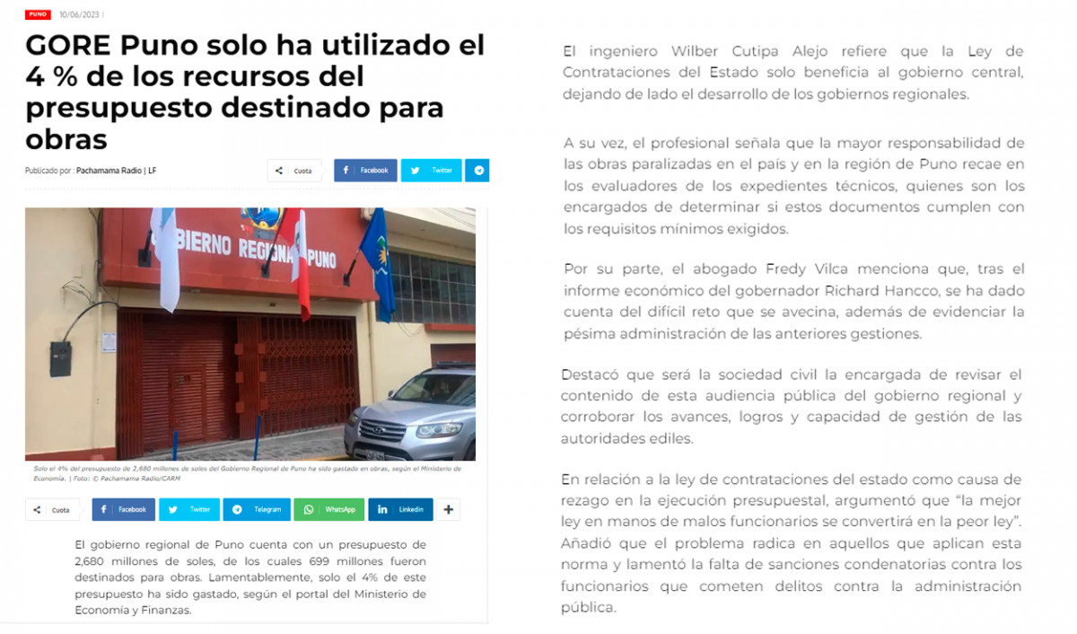 A pesar de que el titular hace referencia a que el porcentaje proviene de solo el importe para obras públicas, en la leyenda de su portada se lee: “Solo el 4% del presupuesto de 2.680 millones de soles del Gobierno Regional de Puno ha sido gastado en obras”.